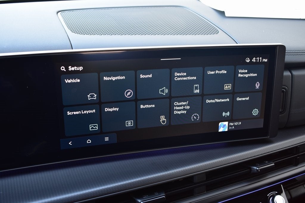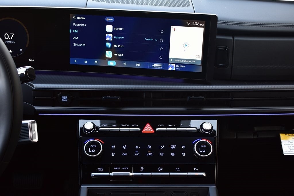 - Radio: AM/FM/HD Bose Premium Audio System -inc: 12 speakers including subwoofer, external amplifier, 12.3" wide touchscreen, Apple CarPlay and Android Auto, Bluetooth® hands-free w/wireless audio streaming, dynamic voice recognition, USB connectivity, SiriusXM, Blue Link+ connected car system, navigation system including traffic flow w/incident data via HD Radio (HERE) and rear seat quiet mode